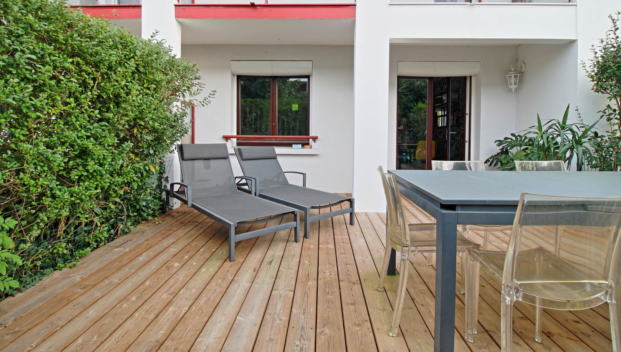 La terrasse d’environ 20m² en bois (pin) est neuve et accueillante.