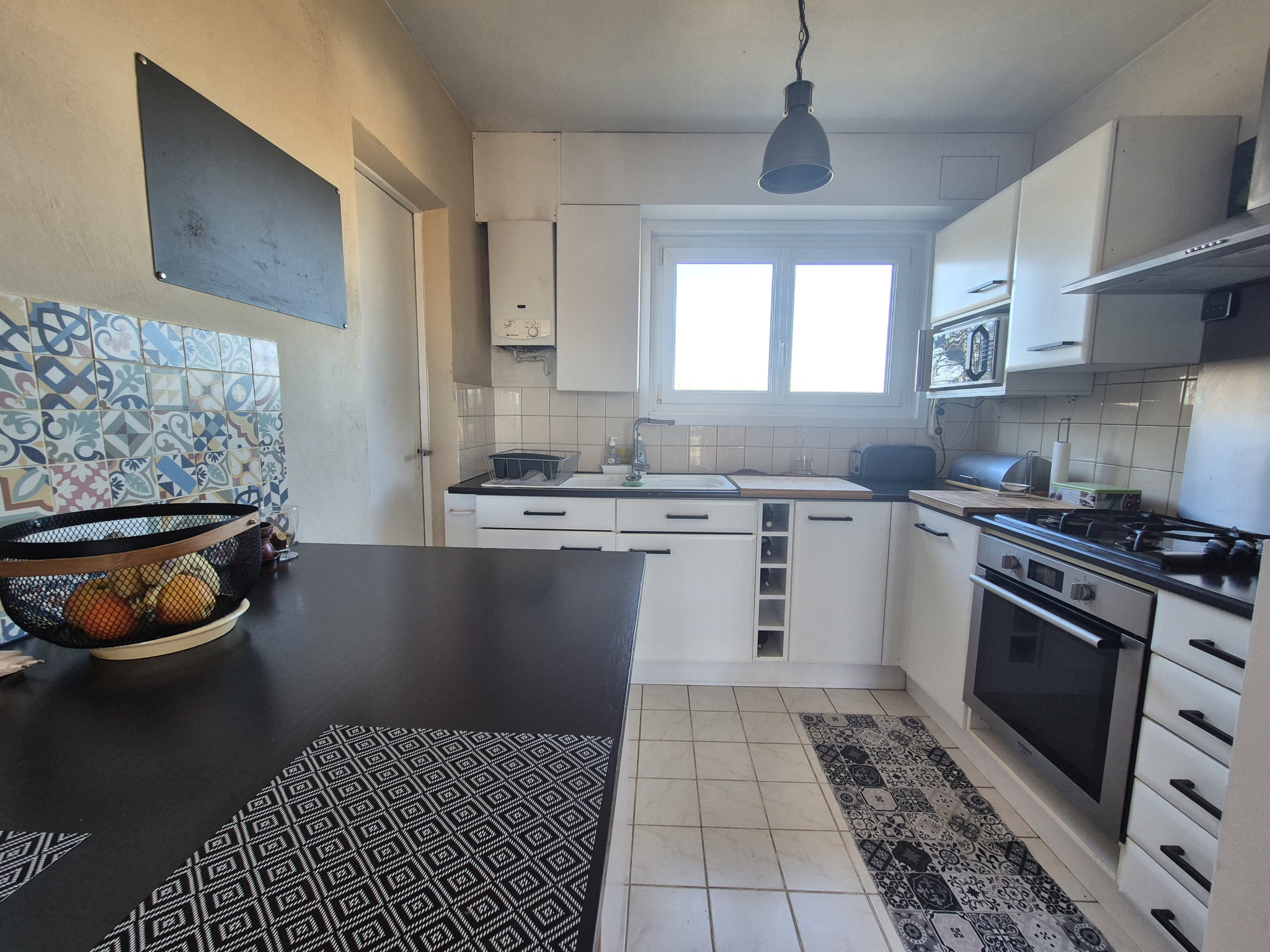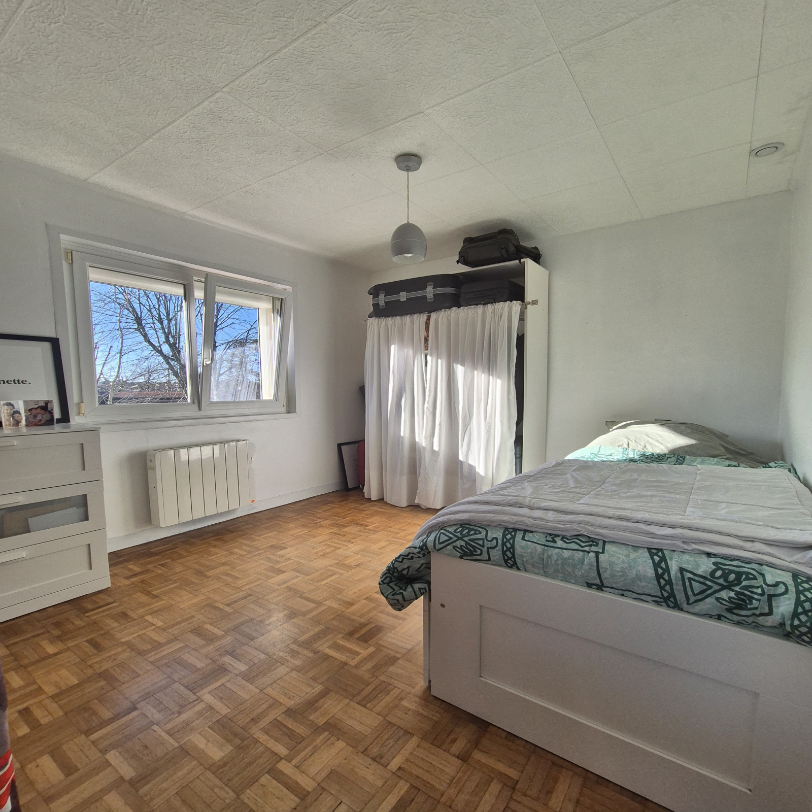 L’appartement comprend aussi une cuisine ouverte avec son cellier, un espace nuit avec trois chambres, une salle d’eau, un WC indépendant ainsi qu’un grand placard dans le couloir.