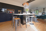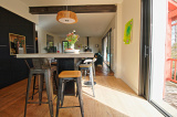 L’accès par la terrasse d’accueil propose une entrée avec rangements sur mesure, un WC convives, une pièce de vie traversante de plus de 60m² avec cuisine aménagée et équipée (conception Atelier contemporain Biarritz) ouverte sur le séjour double avec espace salon et poêle à bois suspendu, salle à manger et espace lecture. Le tout donnant sur une terrasse plein sud accessible via une double baie vitrée. Une buanderie / lingerie et une chambre de plain-pied complète le niveau.