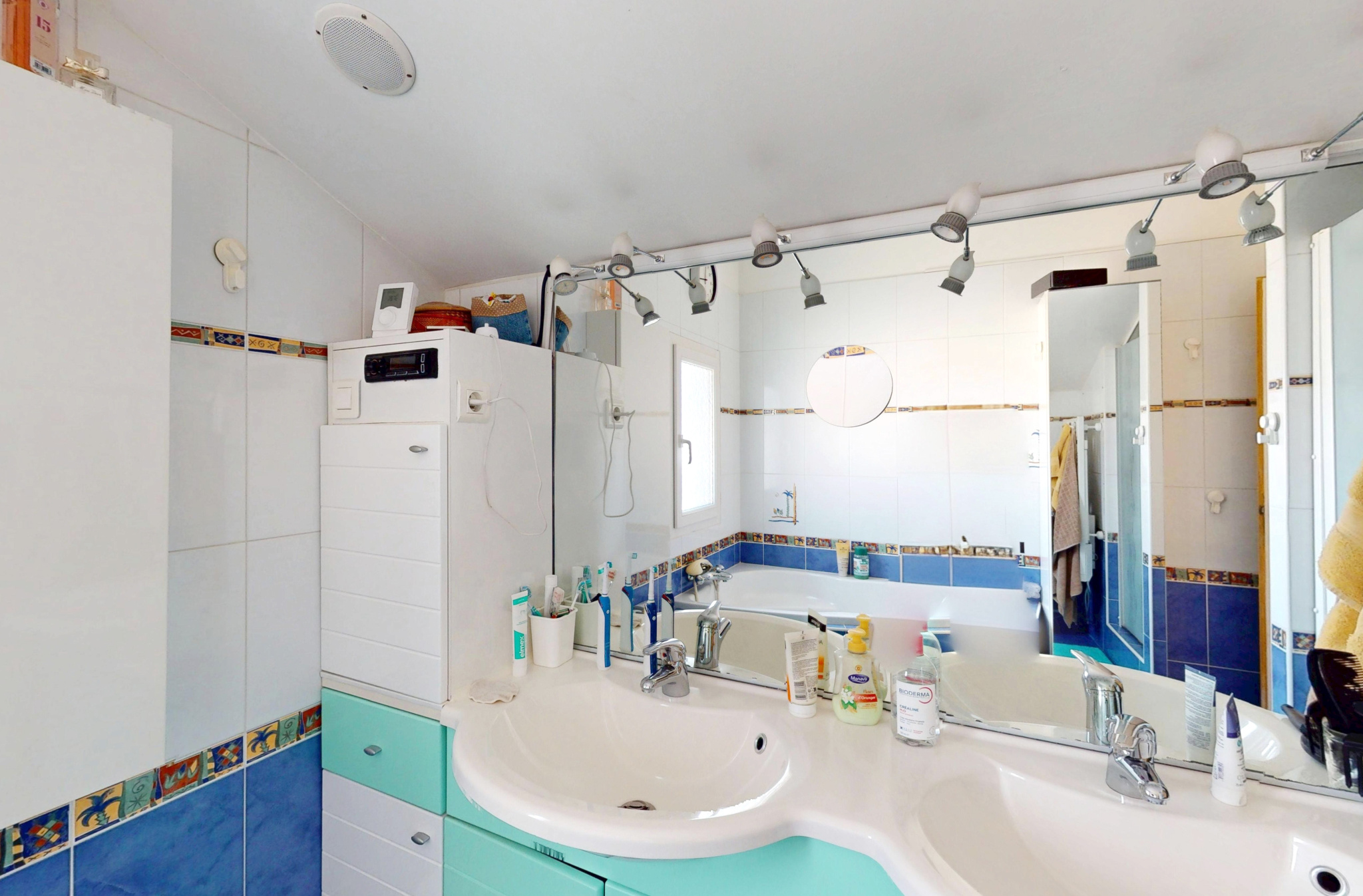 À l’étage, l’espace nuit se compose de trois chambres, d’une salle de bains et d’un WC indépendant, permettant une organisation familiale fonctionnelle.