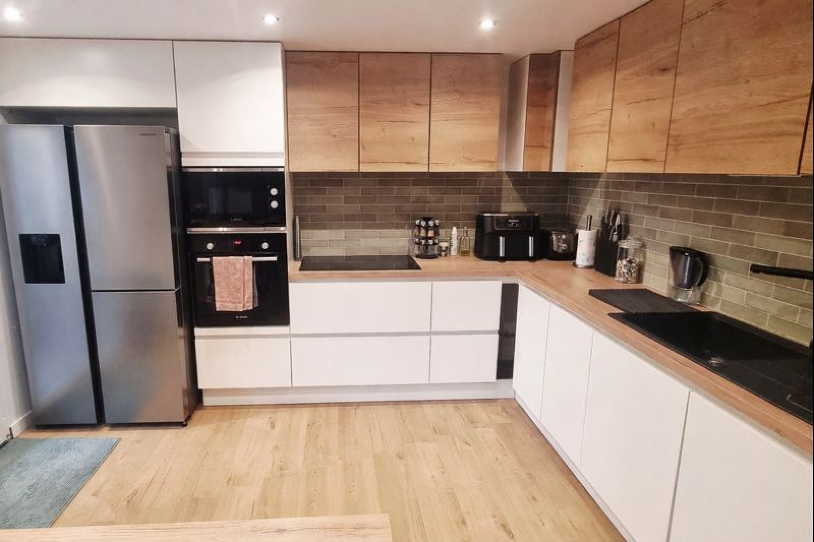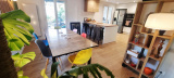 La cuisine équipée, ouverte sur la salle à manger, offre une belle convivialité au quotidien et se prolonge naturellement vers une terrasse exposée Est, puis le jardin.