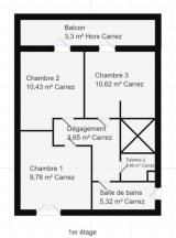 À l’étage, l’espace nuit se compose de trois chambres lumineuses avec placards, d’une salle de bains et d’un second WC indépendant.