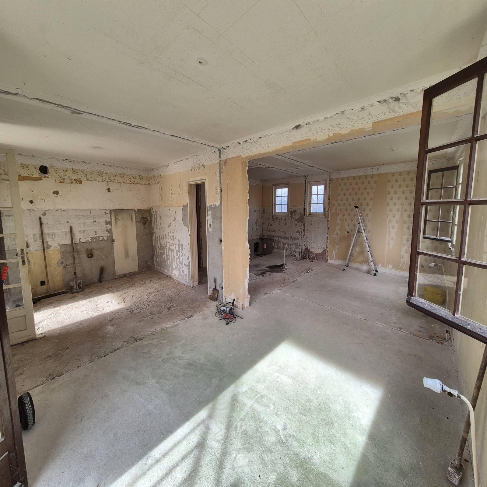 Le rez-de-chaussée (55 m²) est actuellement aménagé en plateau brut.