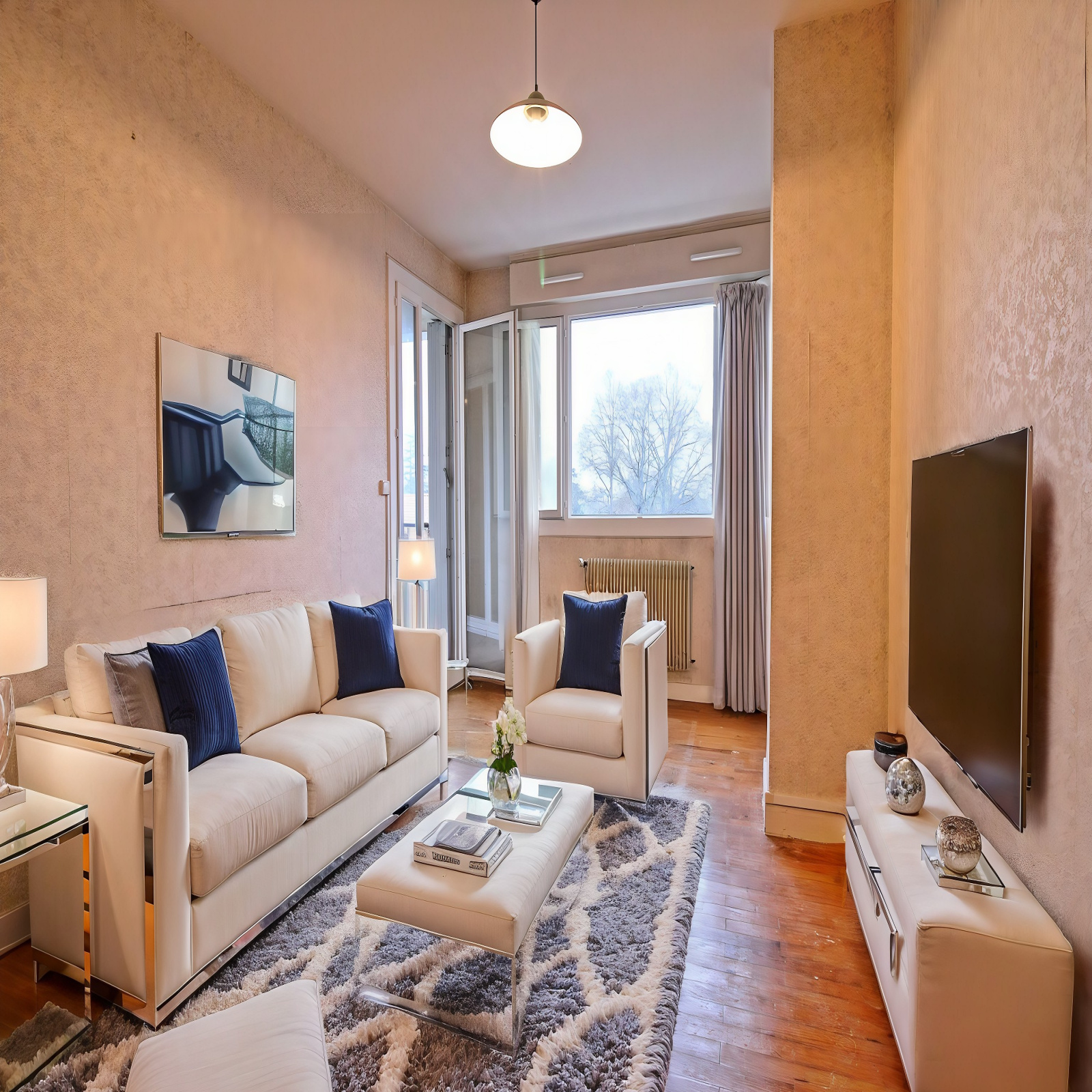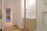 L’entrée dessert une cuisine séparée, un salon ouvrant sur le balcon et donnant également accès à une des chambres, une seconde chambre avec placards et une salle d’eau rénovée ouvrant sur une loggia pouvant servir de buanderie ou de rangements supplémentaires.