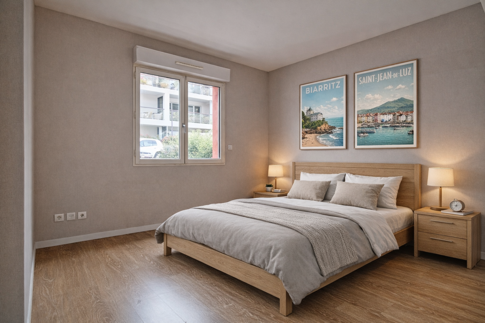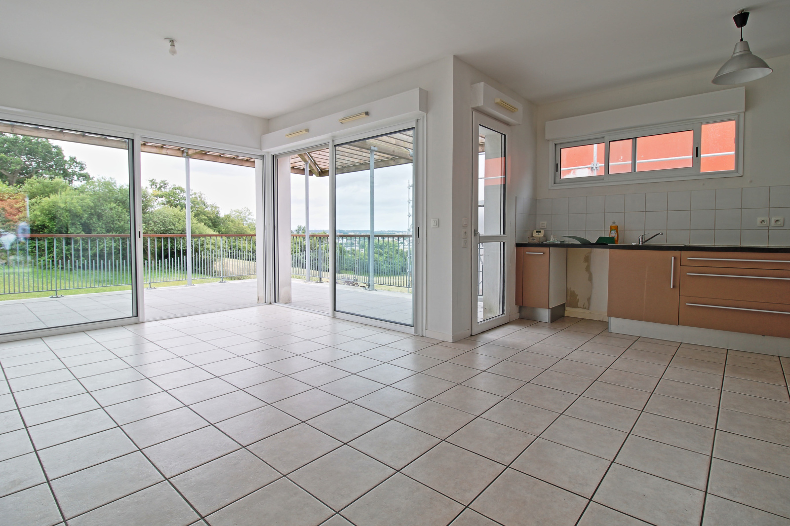 Composé d’une entrée avec placards, d'une pièce de vie avec cuisine aménagée ouverte le tout donnant sur une terrasse de 24m² exposé sud offrant une superbe vue dégagée de Bayonne.