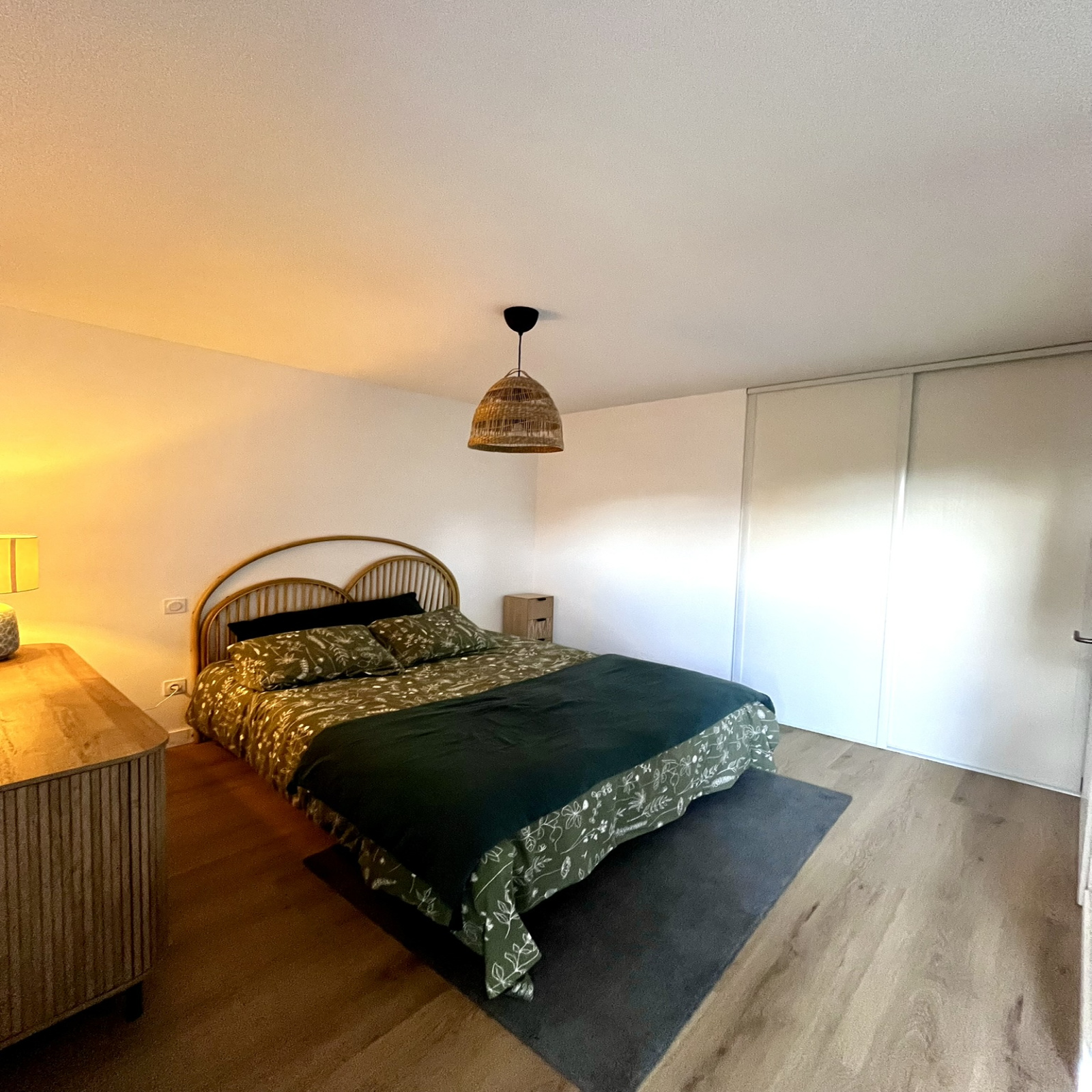 L’espace nuit propose une chambre avec accès direct à la terrasse ainsi qu’une salle d’eau avec WC.
