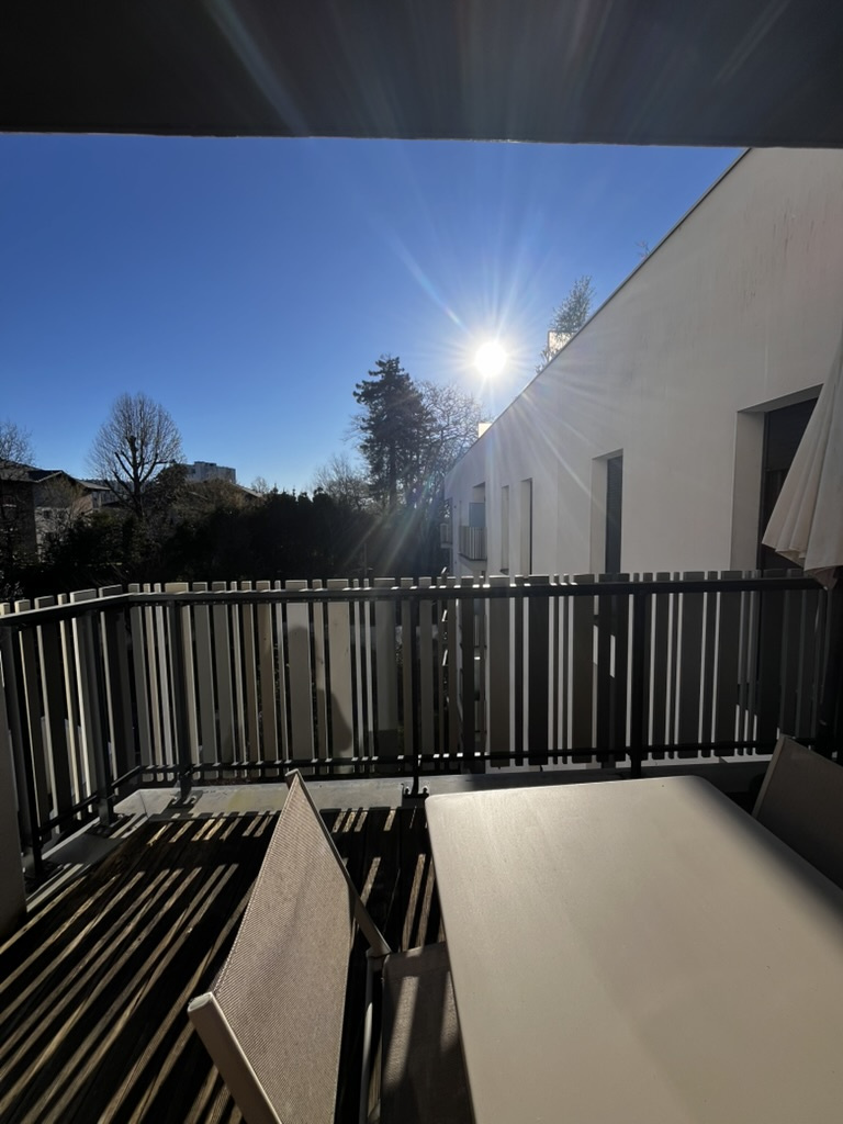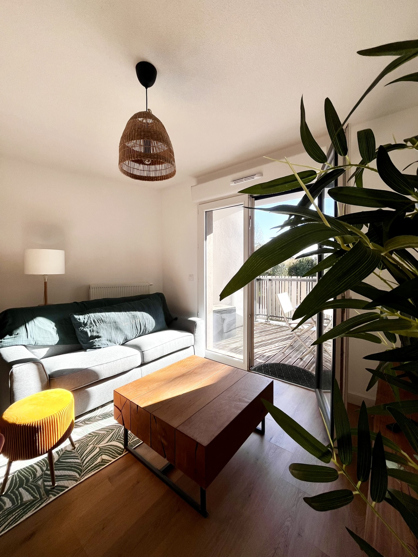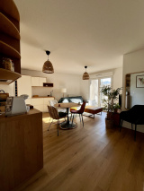 L’appartement s’ouvre sur une entrée avec placard, puis sur une belle pièce de vie lumineuse composée d’un salon et d’une cuisine sur mesure, le tout donnant accès à une agréable terrasse, parfaite pour profiter des beaux jours au calme.