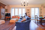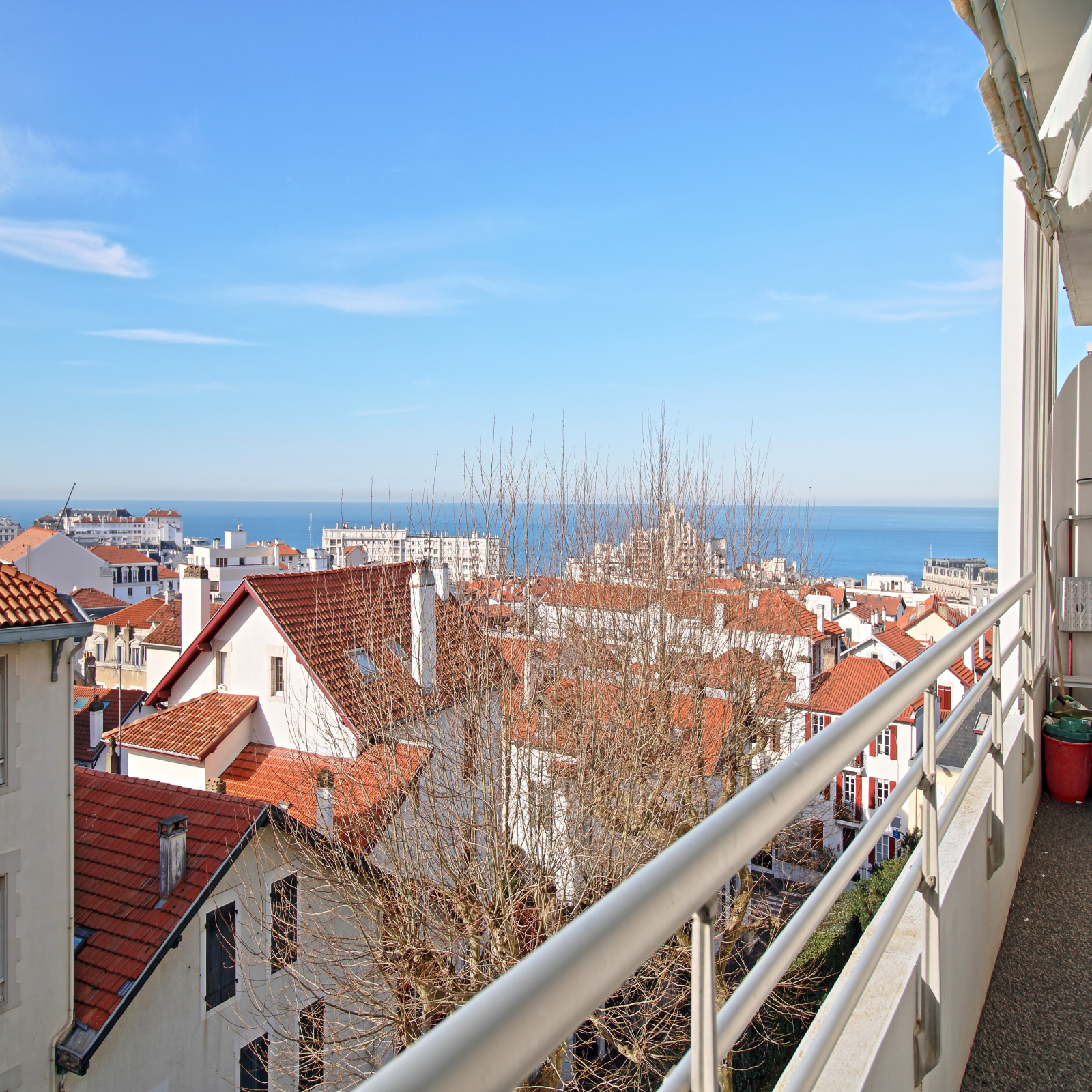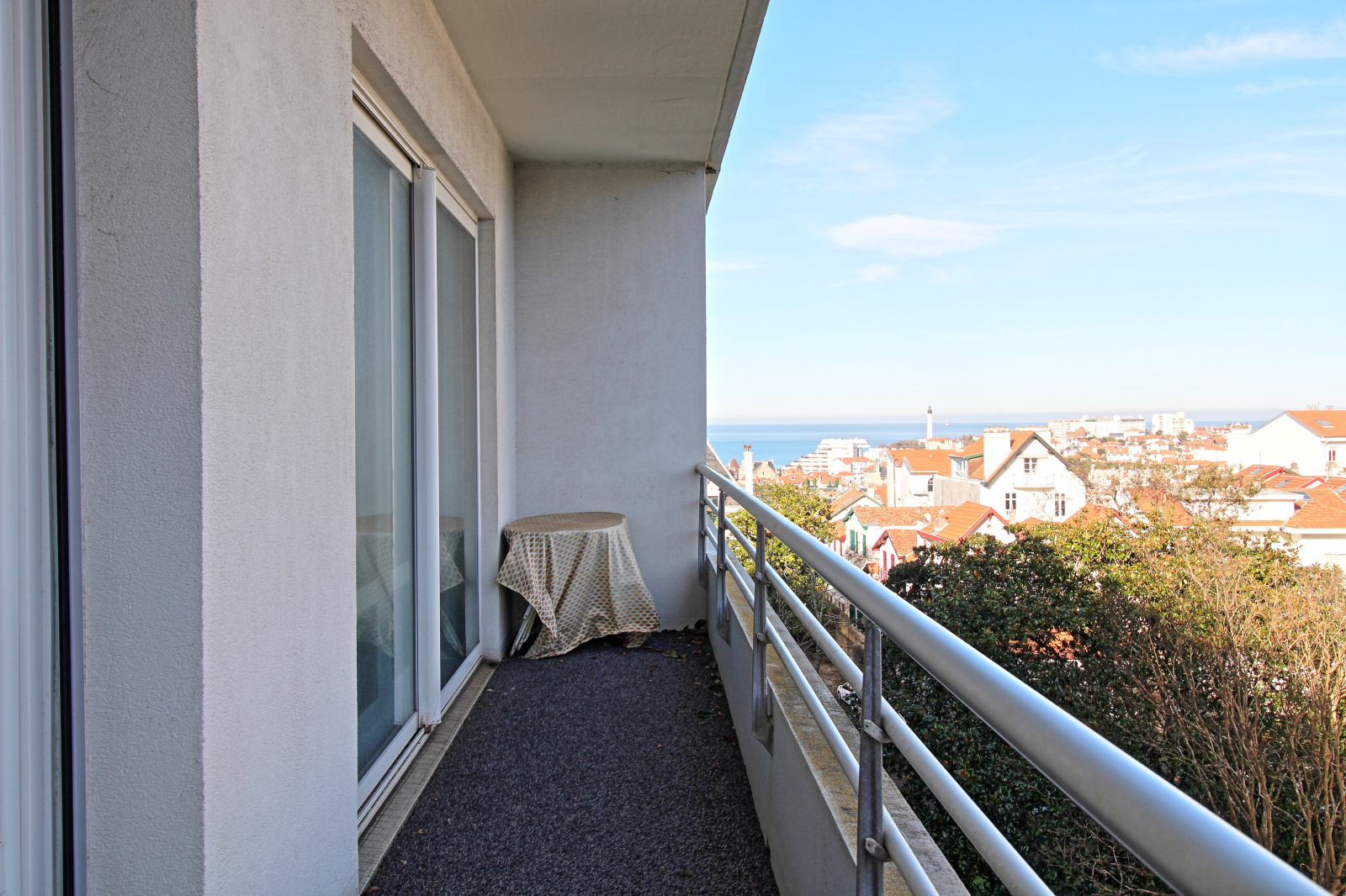 Composé d’une entrée avec placards, une cuisine dinatoire donnant sur un balcon avec vue Océan et Rhune, un double séjour avec salon cheminée (décorative), parquet massif, donnant sur un autre balcon avec aperçu sur le phare de Biarritz.